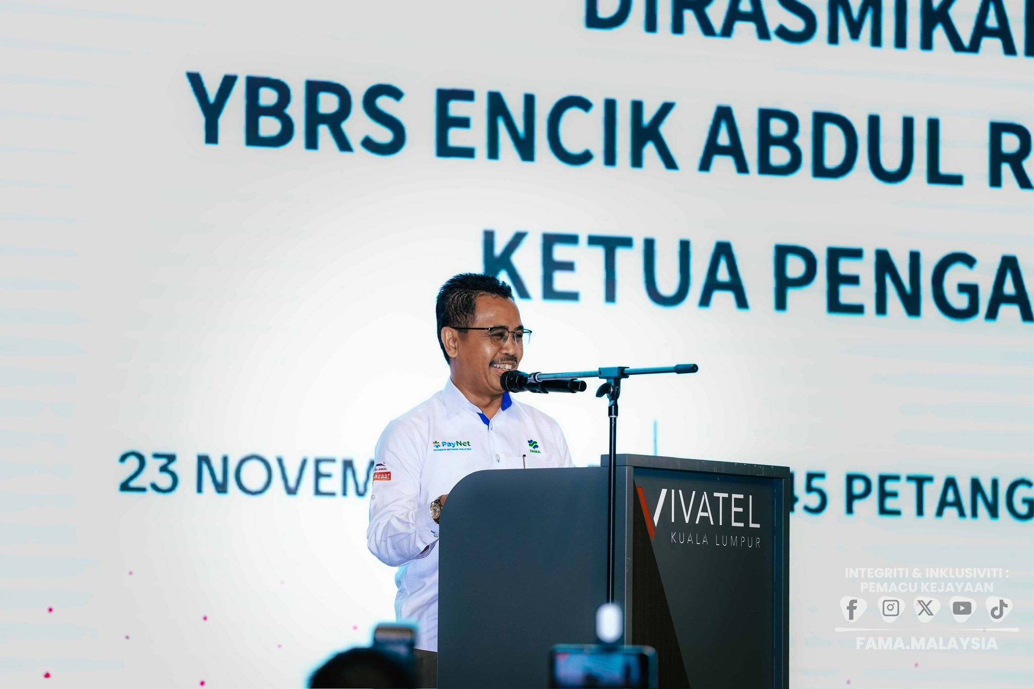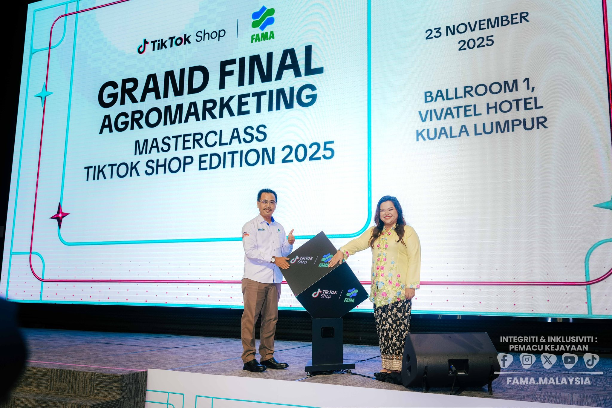 Majlis Grand Final & Penutupan Program telah disempurnakan oleh YBrs. Encik Abdul Rashid bin Bahri, Ketua Pengarah FAMA bertempat di Vivatel, Kuala Lumpur. Turut hadir memeriahkan majlis YBrs. Puan Suraya binti Mohd Yusof, Timbalan Ketua Pengarah (Pembangunan Industri Agromakanan) FAMA, YBrs. Puan Hajah Siti Nurul Haida binti Ibrahim, Pengarah Kanan Keusahawanan Pemasaran, YBrs. Puan Wan Nora binti Wan Ahmad, Pengarah Kanan Pasaran Produk Proses, Encik Muhammad Nor Badlishah bin Ahmad Shahrin, Pengarah Cawangan Korporat & Advokasi dan YBrs. Cik Nur Azre binti Abdul Aziz, Pengarah Kanan Perhubungan Strategik, TikTok Shop Malaysia.
